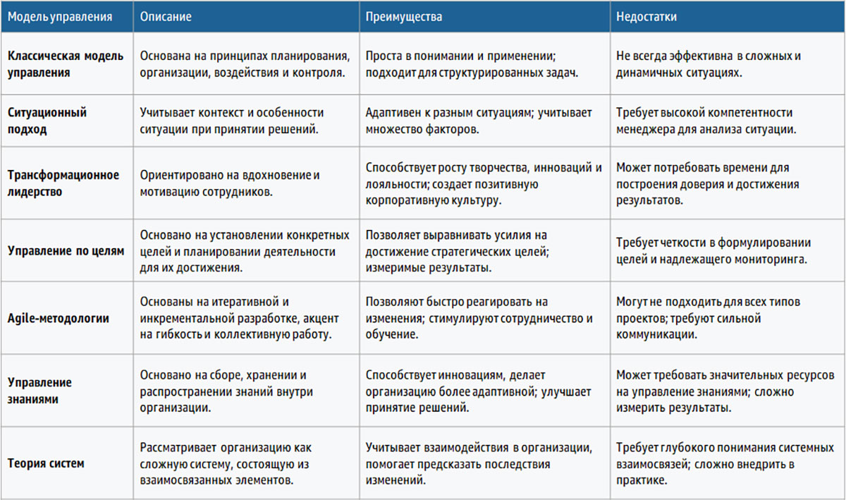 От классических методов, основанных на структурированной организации и контроле, до современных гибких методологий, управление превратилось в искусство адаптации к постоянно меняющимся условиям. В статье представлены семь наиболее распространенных моделей управления, каждая из которых имеет свои преимущества и ограничения. Эта сравнительная табица поможет вам лучше понять разнообразие подходов и выбрать наиболее подходящий для вашей организации с учетом конкретных целей и ситуации.